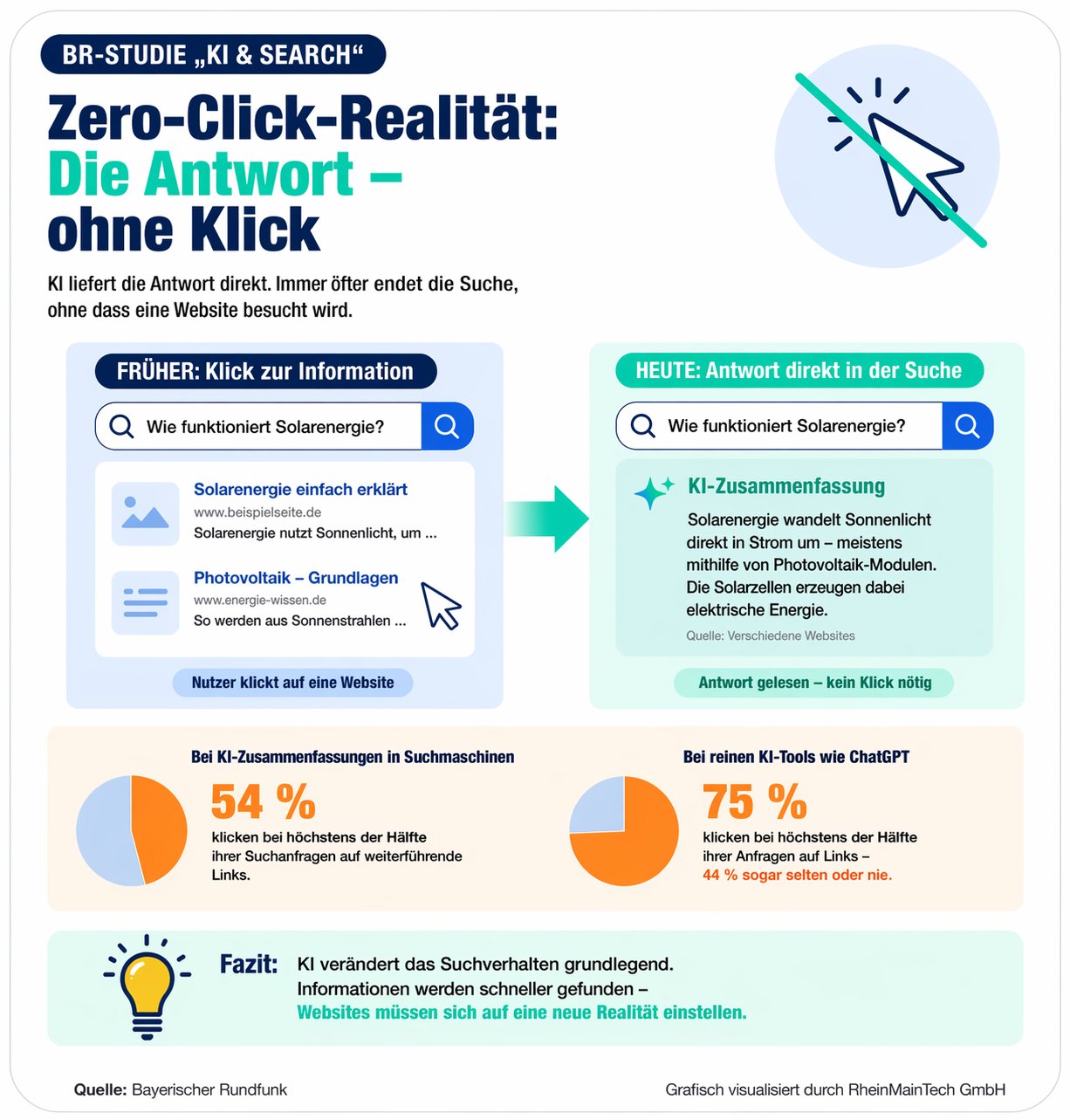 Laut der repräsentativen Studie des Bayerischen Rundfunks nutzen bereits 82 Prozent der Deutschen KI-Tools für ihre Informationssuche. Besonders bei der Generation unter 30 Jahren ist die KI-Suche mit einer Quote von 94 Prozent längst Alltag geworden. Diese Entwicklung befeuert das Phänomen der „Zero-Klick-Suche“ massiv: Über 54 Prozent der Nutzer geben an, bei KI-Zusammenfassungen nur noch selten auf die eigentlichen Website-Links zu klicken.